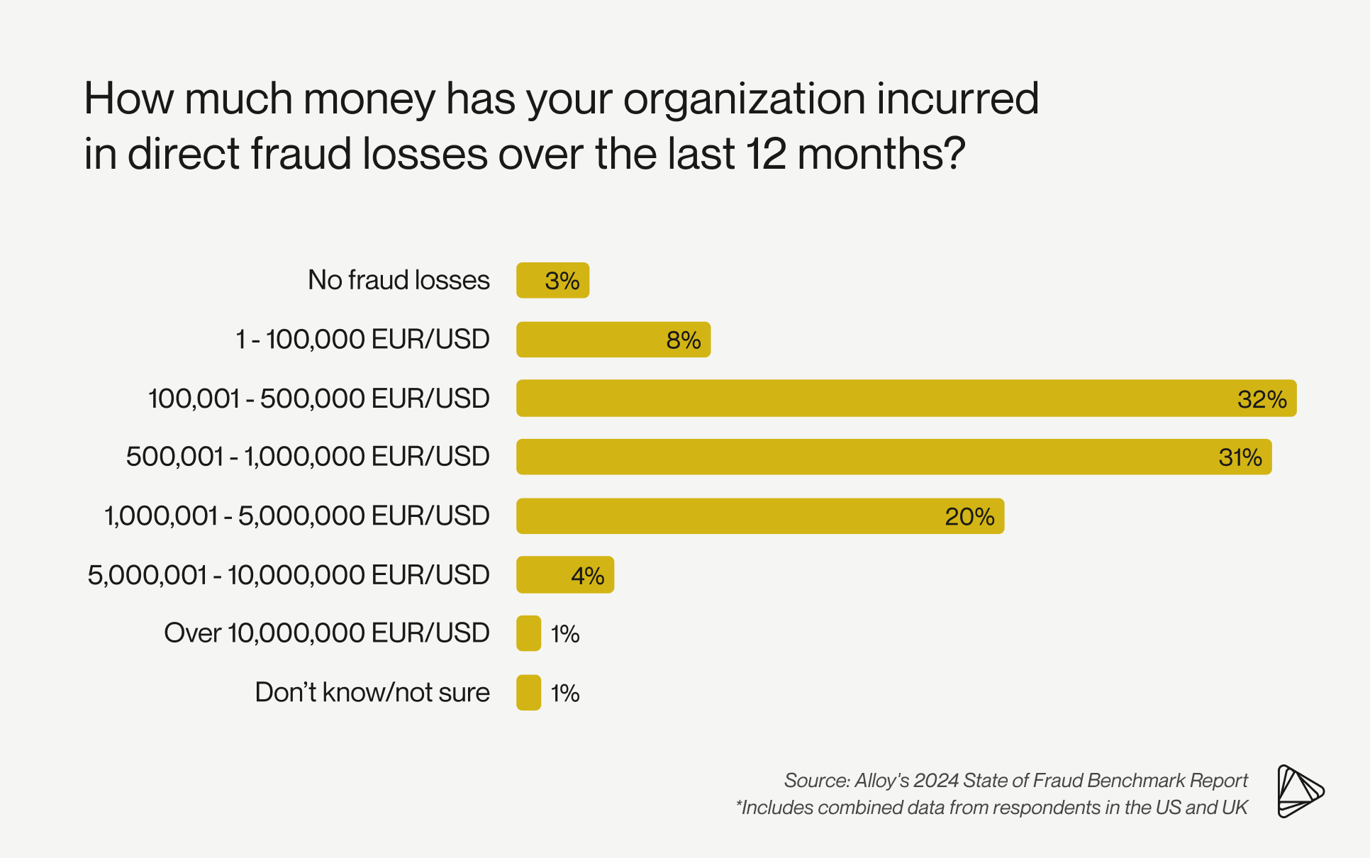 NEW YORK, January 25, 2024 -- Alloy, the identity risk management company behind over 500 leading banks and fintech companies, today released its 2024 State of Fraud Benchmark Report, finding that after years of steadily increasing fraud rates, the number of reported fraud attacks have begun to even out – and for some organizations, to decelerate. Despite that progress, fraud has still resulted in significant financial losses: 56% of respondents lost more than 500,000 (EUR/USD) to fraud in the last 12 months, and 25% lost over 1M (EUR/USD) in that time.