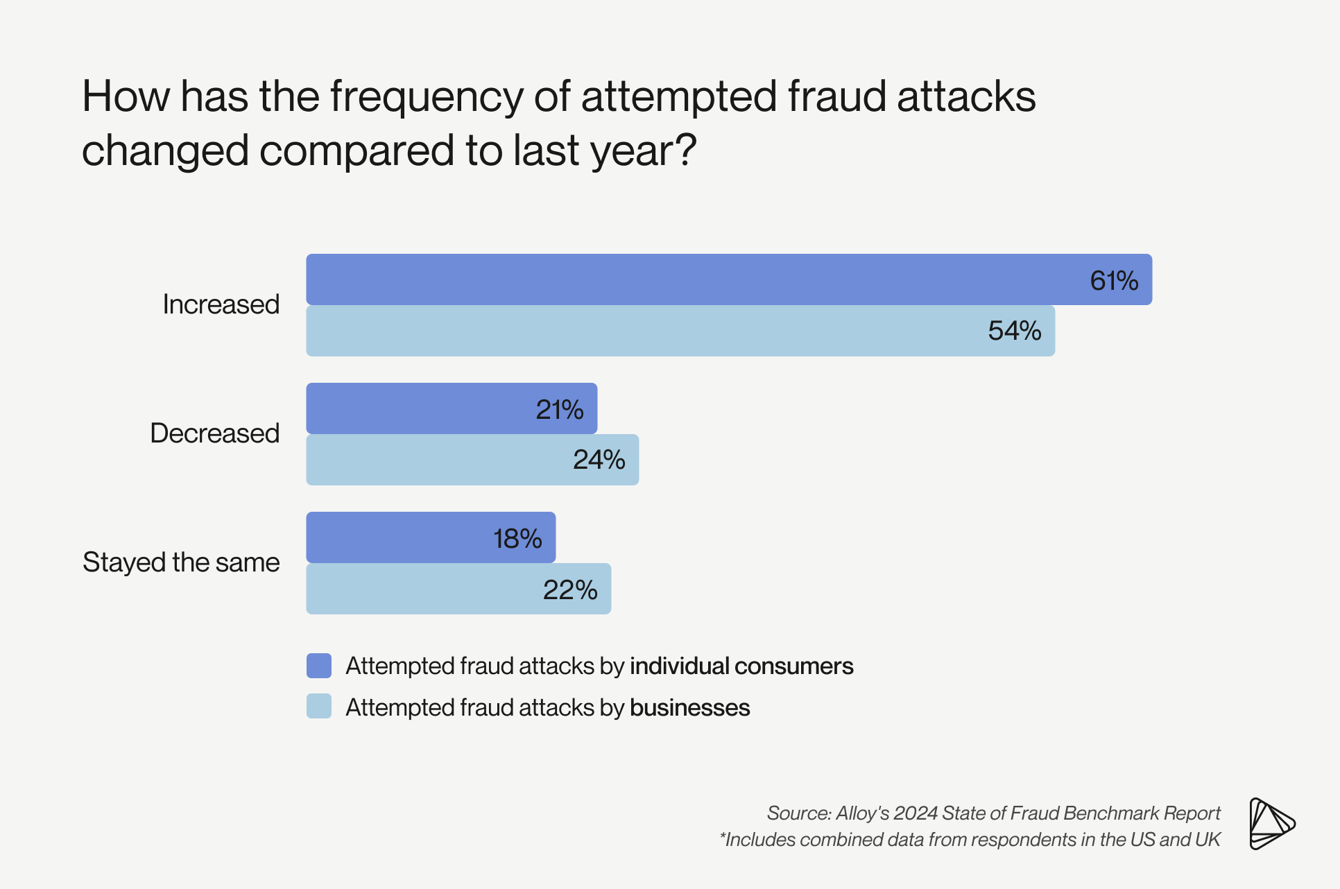 This year’s report revealed a drop in the number of companies that have experienced 1,000 or more fraud attempts over the past year: In 2023, 35% of companies experienced 1,000+ fraud attempts, down from 47% in 2022. But it’s not all good news: 61% of companies saw an increase in attempted fraud attacks committed through consumer accounts in the past year, and 54% saw an increase in attempted fraud attacks committed through business accounts.