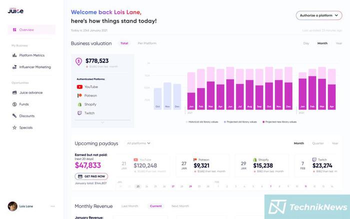 Creative Juice is a fintech company that is addressing this issue by building a comprehensive dashboard. With Juice, creators put all the important information a creator needs on one screen, making it easy to assess and track how a business is doing at a glance.