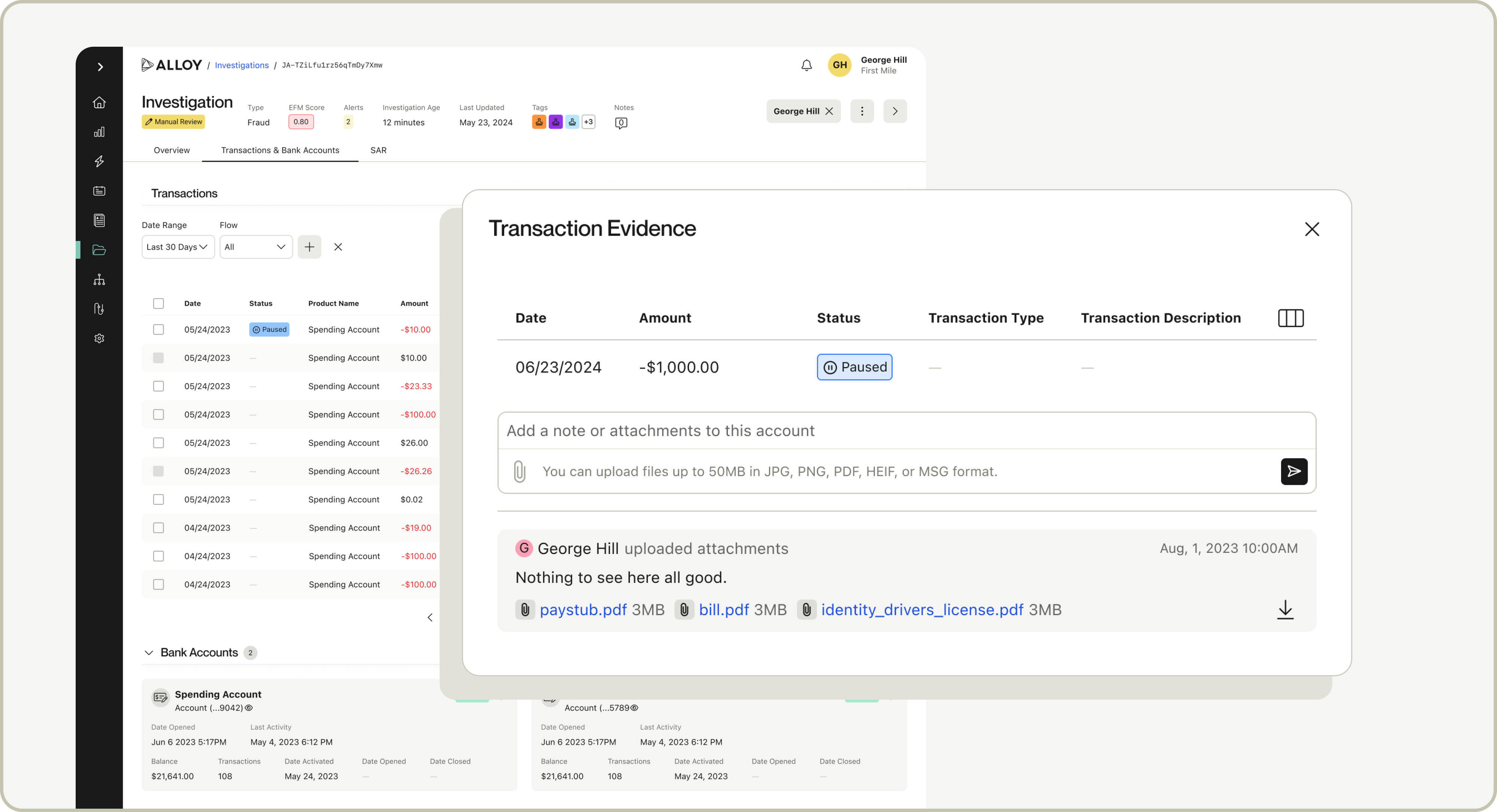 Users can now attach notes and/or upload supporting documentation to customer transactions and bank accounts as "evidence” - all from the Investigations UI!